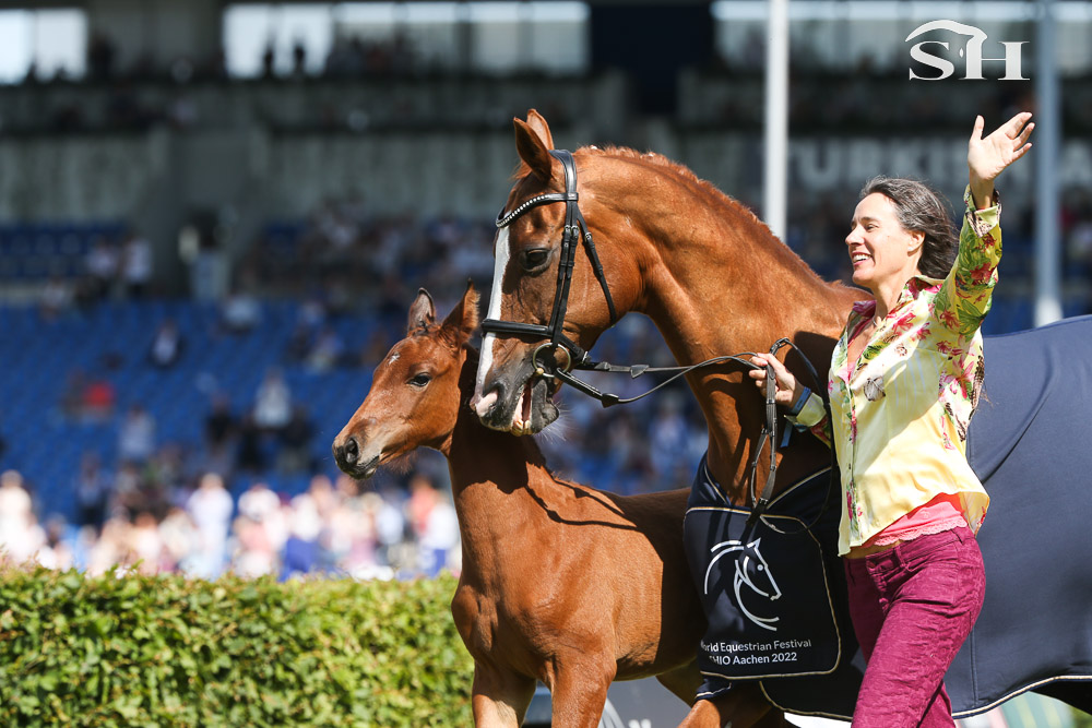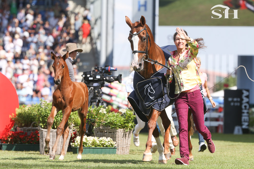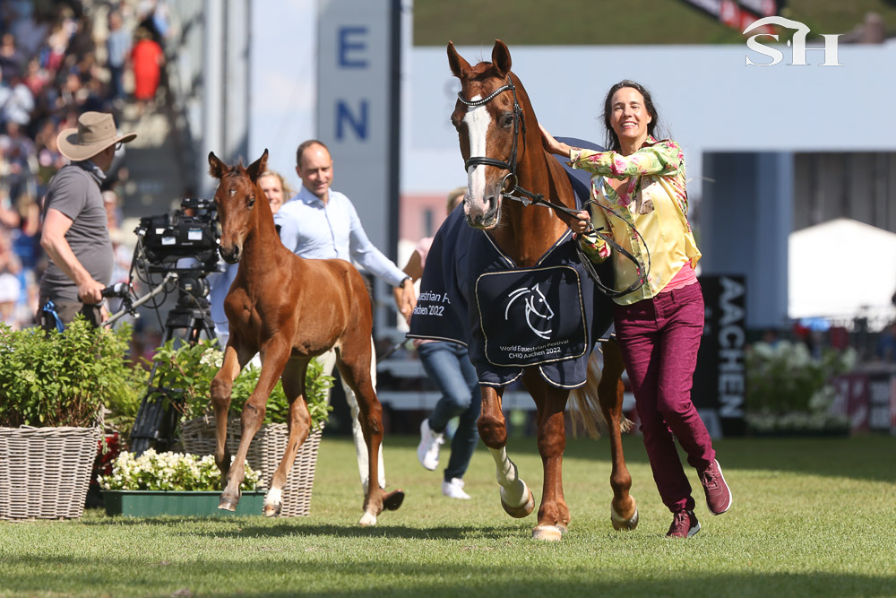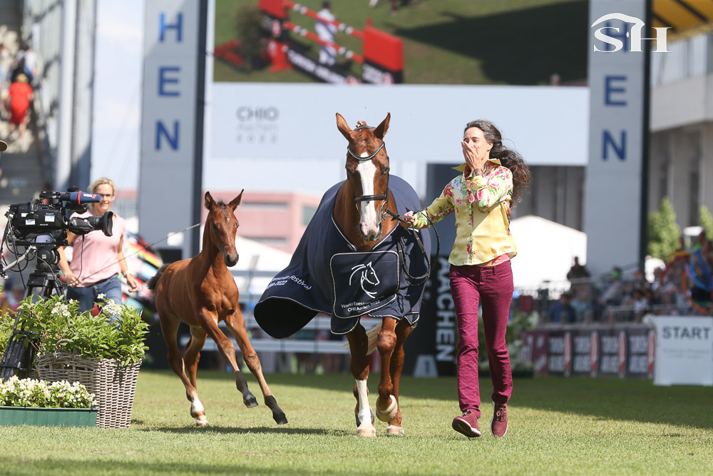 Sa dernière apparition en concours remonte à l’étape de coupe du monde de Stuttgart en novembre 2019 où elle n’aura, une nouvelle fois, pas fait tomber de barre. Depuis, le covid est passé par là et n’avait pas permis à l’une des meilleures juments du monde de faire ses adieux à la compétition. Dimanche, à Aix la Chapelle, entre les deux manches du Grand Prix où elle fut seconde en 2017 et 2018, cette injustice a été réparée mais du coup, l’alezane qui a fait partie durant de nombreuses années des meilleures juments du monde en faisant rêver les spectateurs et de nombreux cavaliers sous la selle de Luciana Diniz n’est pas venue seule … mais accompagné de son poulain Emotion for Fun par Eldorado vd Zeshoek.