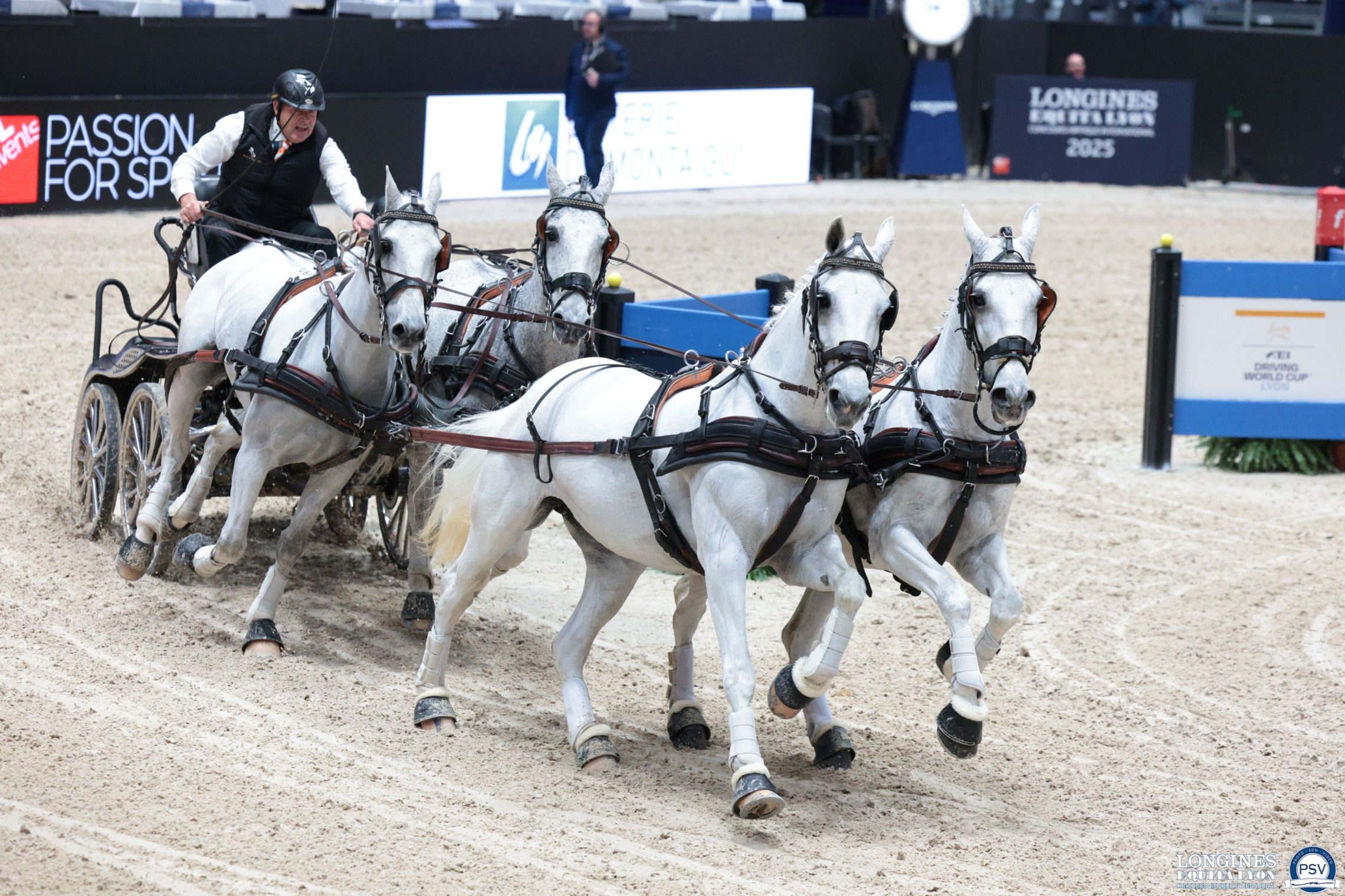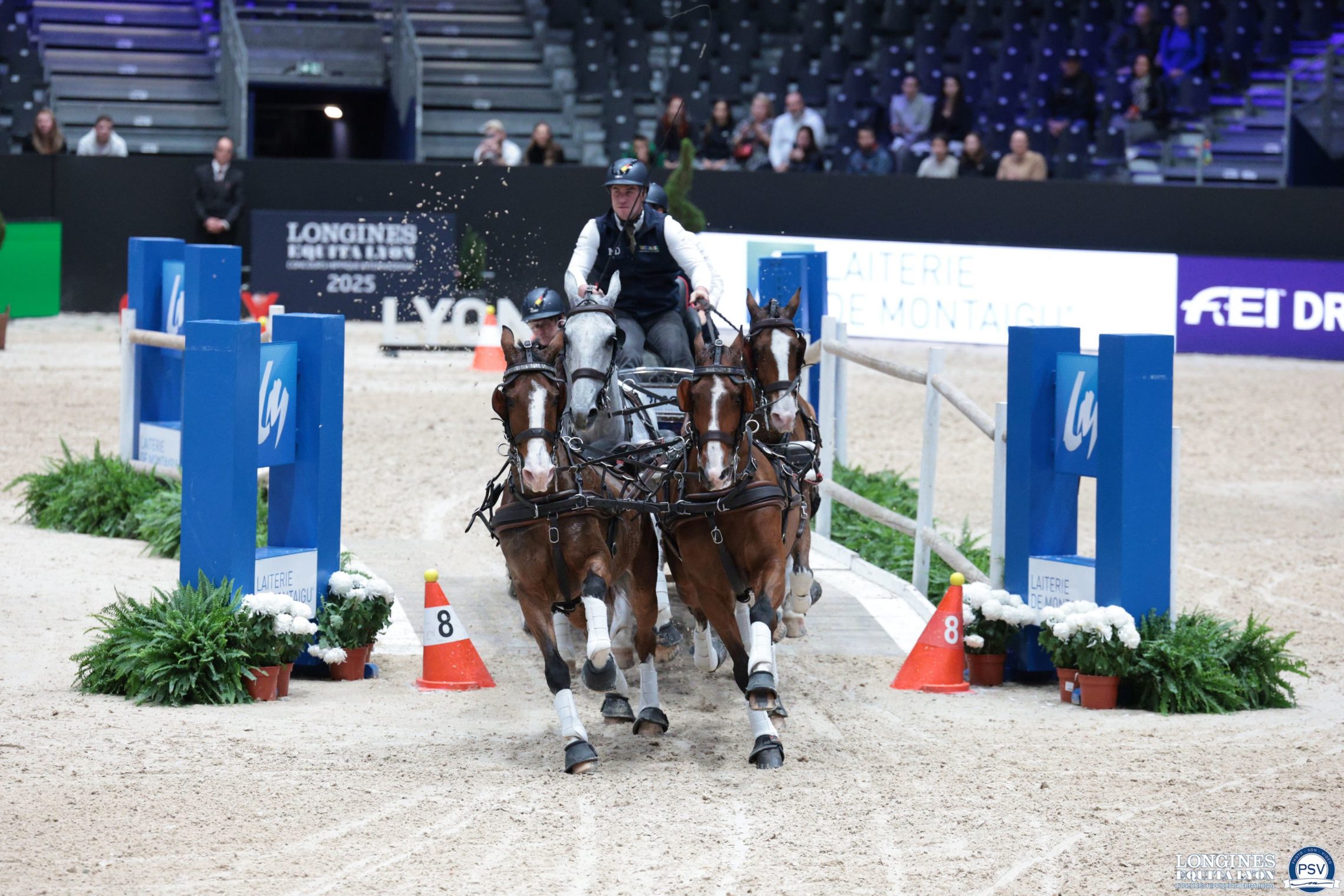 Ce samedi matin, Equita Lyon vibrait au rythme de la Coupe du monde FEI d’attelage à 4 chevaux. Six attelages, un parcours mêlant maniabilité et obstacles de marathon, et deux phases : un passage chronométré et un « drive-off » au départ inversé.