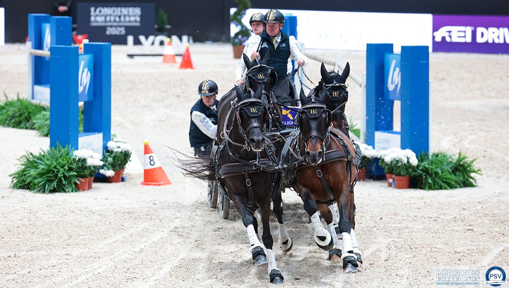 Ce samedi matin, Equita Lyon vibrait au rythme de la Coupe du monde FEI d’attelage à 4 chevaux. Six attelages, un parcours mêlant maniabilité et obstacles de marathon, et deux phases : un passage chronométré et un « drive-off » au départ inversé.