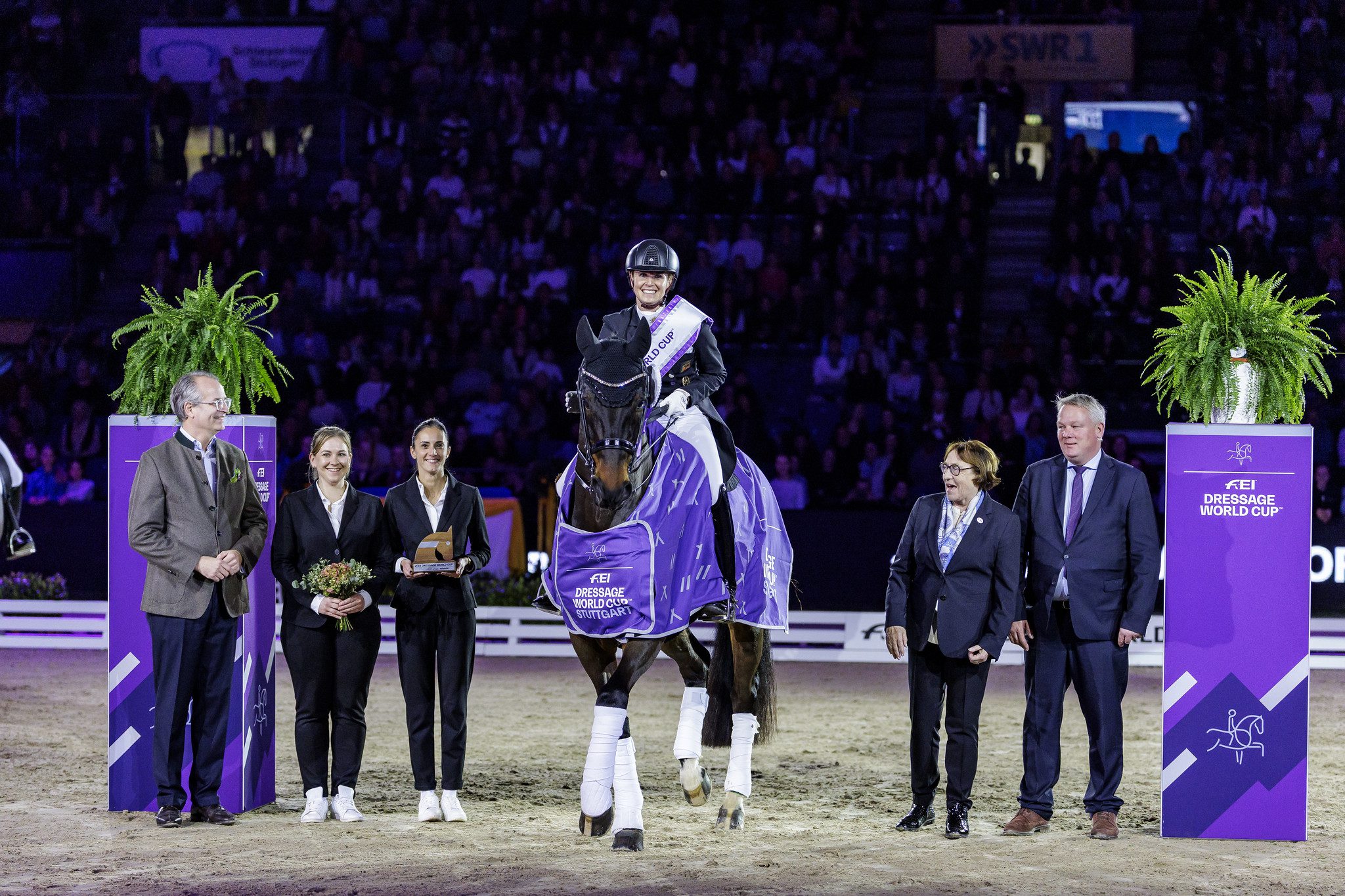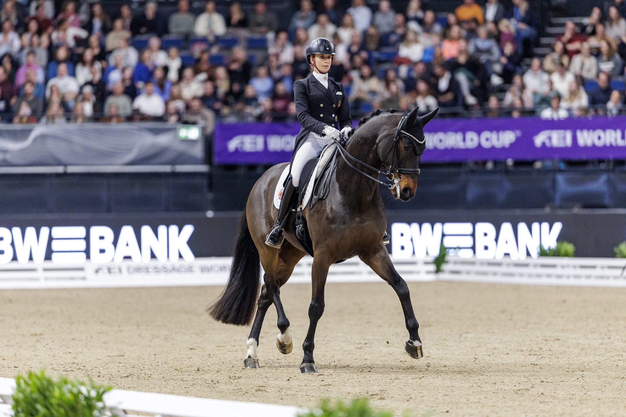 La reine du Dressage allemand, quadruple championne olympique, n’avait même pas besoin d’un tapis rouge : il lui suffisait d’un carré de 20×60 et d’un hongre hanovrien qui disputait là… sa première Freestyle de Coupe du monde. Rien que ça. Un baptême du feu transformé en nuit de noces, trois juges au-dessus des 90 % artistiques, et l’impression générale que tout avait été pensé pour que le public ne respire qu’entre deux foulées.