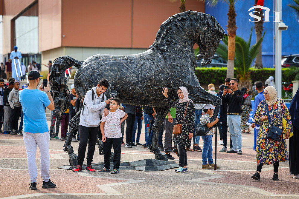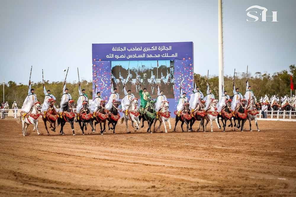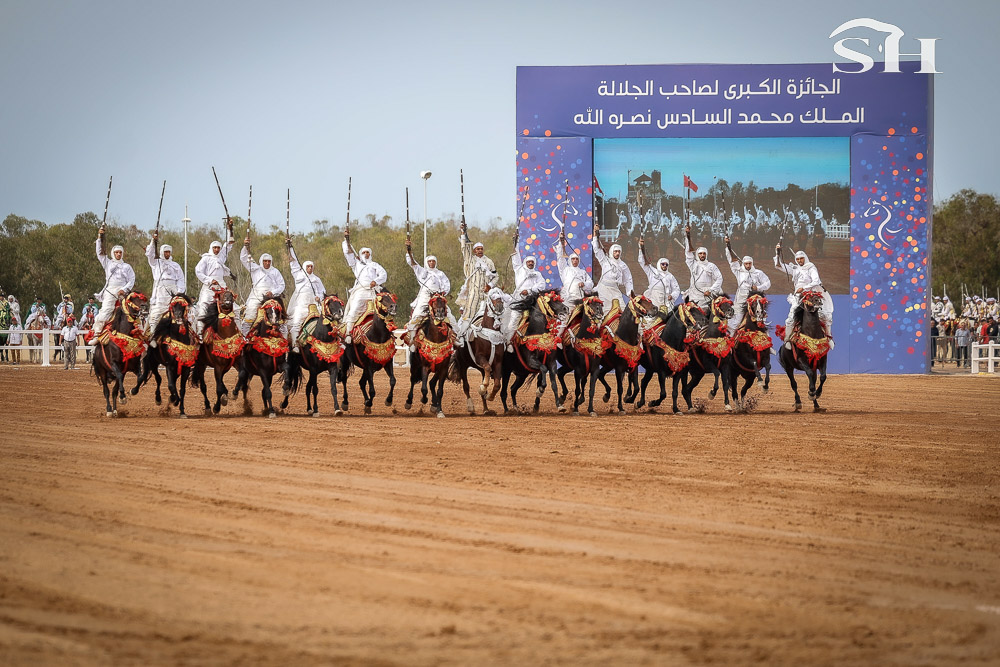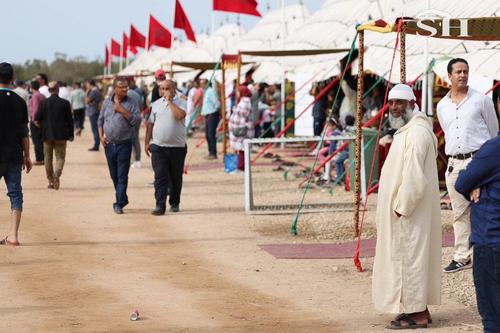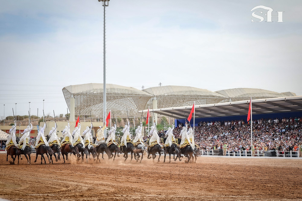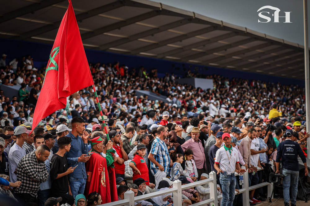 Le salon, un incontournable pour beaucoup d’habitants de la région et pour toutes les écoles qui y défilent durant cinq jours. Et le graal pour tous ces visiteurs, c’est de se faufiler dans le stade plein comme un oeuf, au bord du mahrek, cette piste en terre rouge longue de 200m où s’affrontent les 18 troupes (ou sorbas) venues de représenter douze régions du royaume et tenter de remporter le Grand Prix de Sa Majesté le Roi Mohamed VI.
