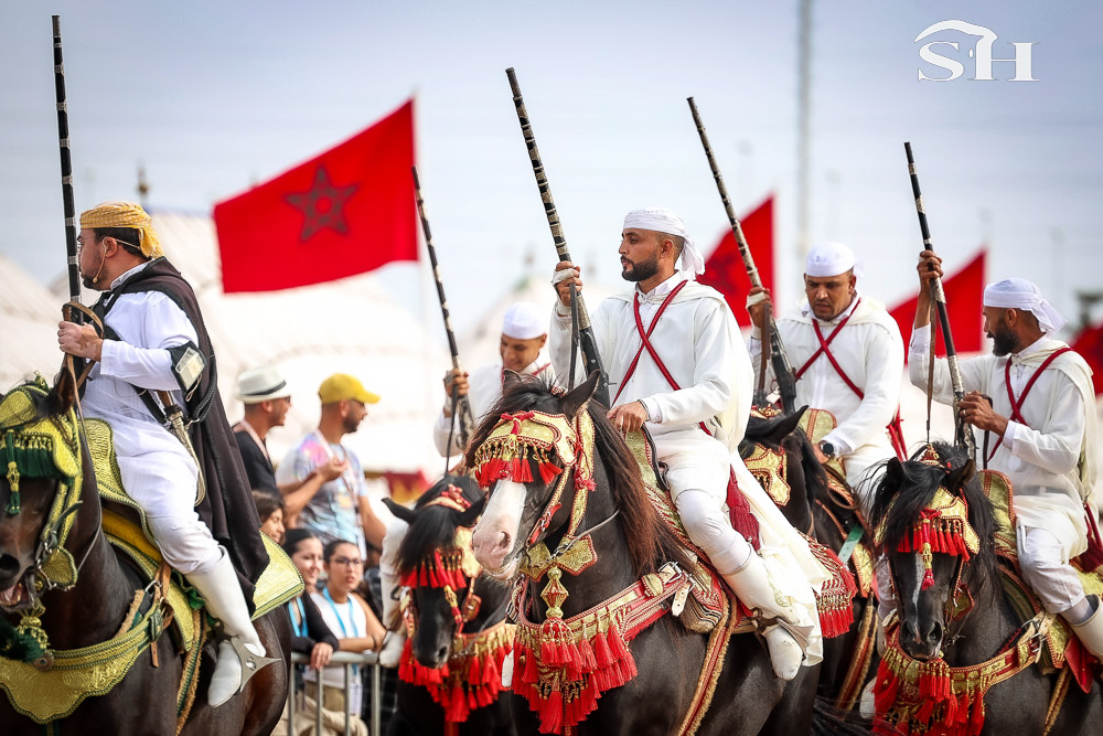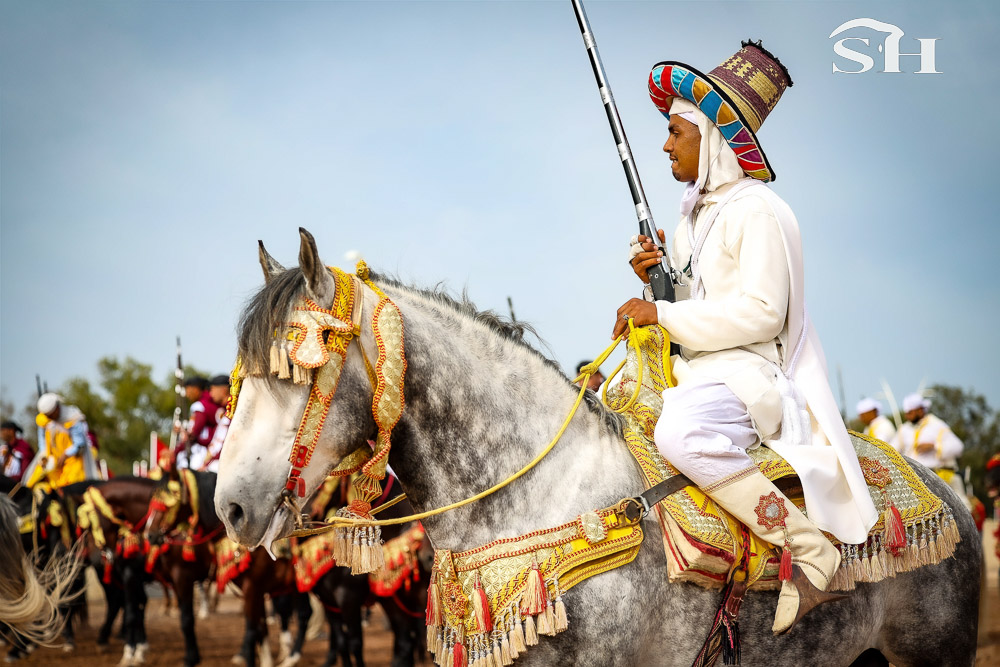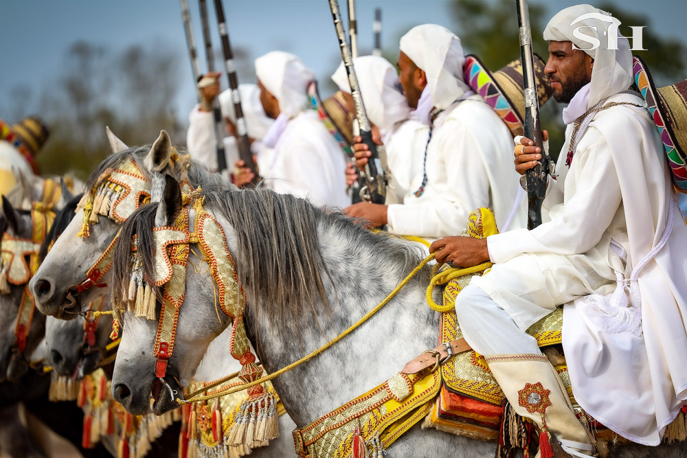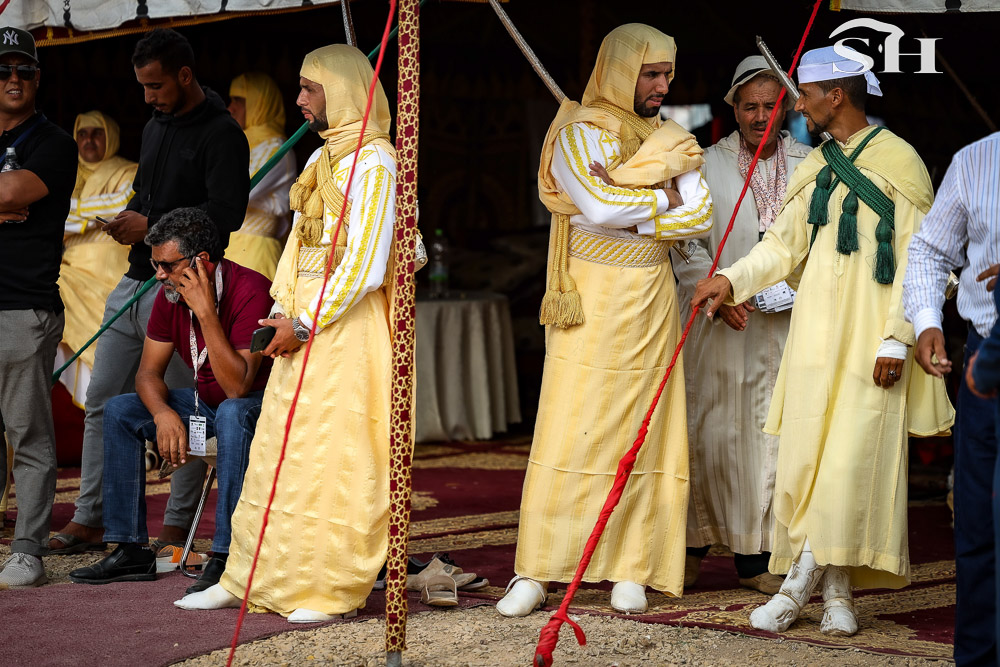 Mais la Tbourida que l’on appelle aussi fantasia ne serait rien sans ses chevaux. Eux aussi sont caparaçonnés de leurs plus beaux atours, mais c’est par leur calme à toute épreuve qu’ils étonnent surtout.