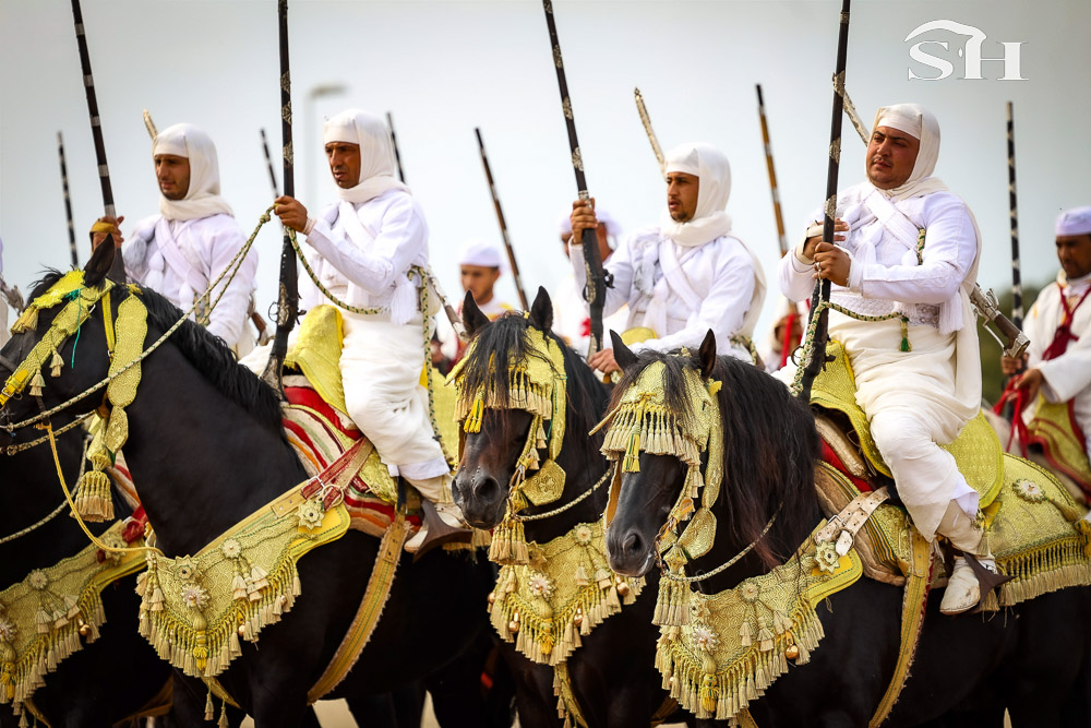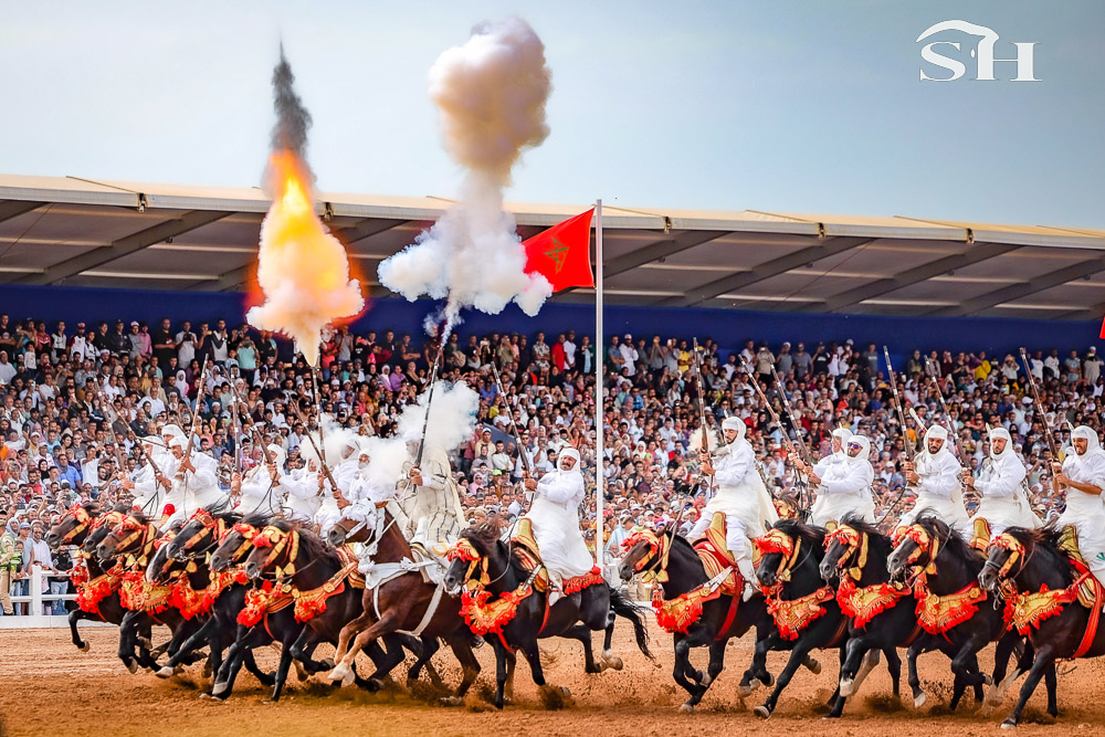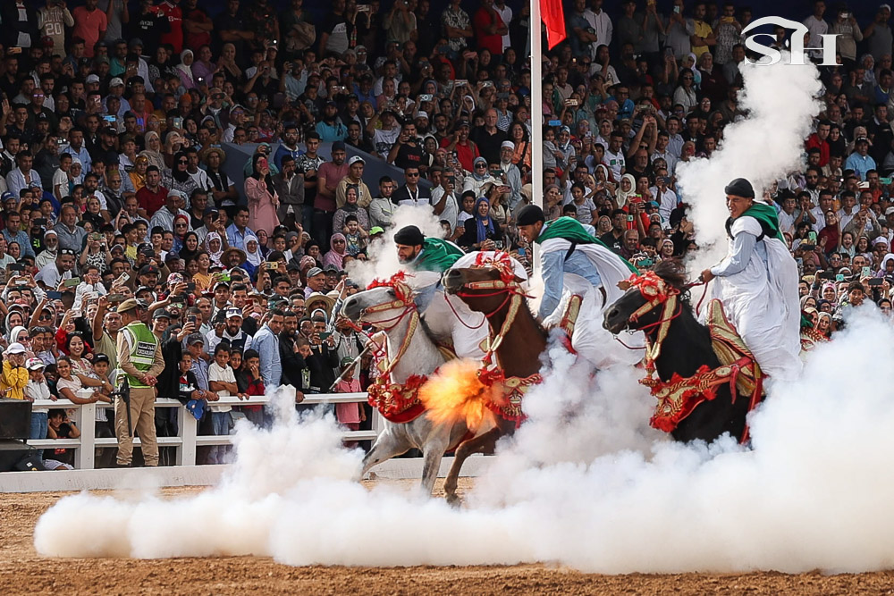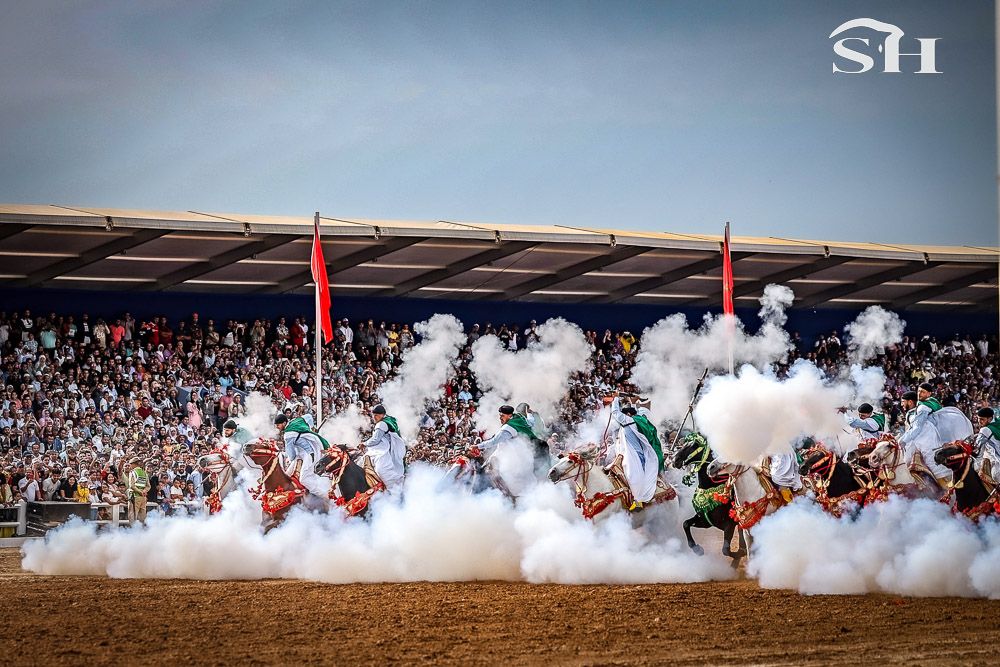 Au milieu de la foule, la compétition de tbourida se vit avec presque tous les sens. Les couleurs vous sautent aux yeux, une odeur âcre vous prend le nez. Une odeur que l’on identifie instantanément quand la première salve de détonations retentit. Ah oui, au fait, le terme “tbourida” vient de “poudre à canon”. Ce détail, vous vous rendez-très vite compte que ce n’en est pas un. Car même quand on y est préparé, vous ne pouvez vous empêcher de tressaillir au moment où les cavaliers alignés déboulant au galop en suivant les ordres du mokkadem, appuient sur la gâchette et déclenchent, en plus de votre sursaut, un coup de tonnerre qui n’a d’égal que le nuage de fumée qui l’accompagne. En plus de la moukalha, ce fusil typique marocain qui crache sa poudre noire, l’équipement des cavaliers est plutôt fourni: une djellaba, un seroual, une rezza ( turban ), des bottes équestres traditionnelles (tmagh), un petit livret de coran, un poignard (khanjar) et parfois un sabre (nimcha) accroché dans le dos.