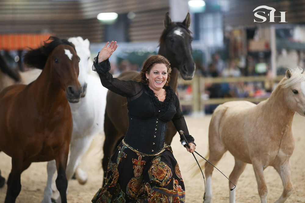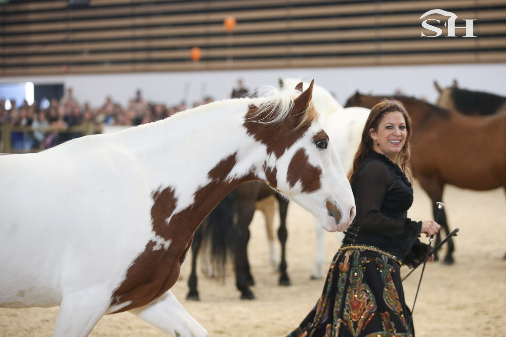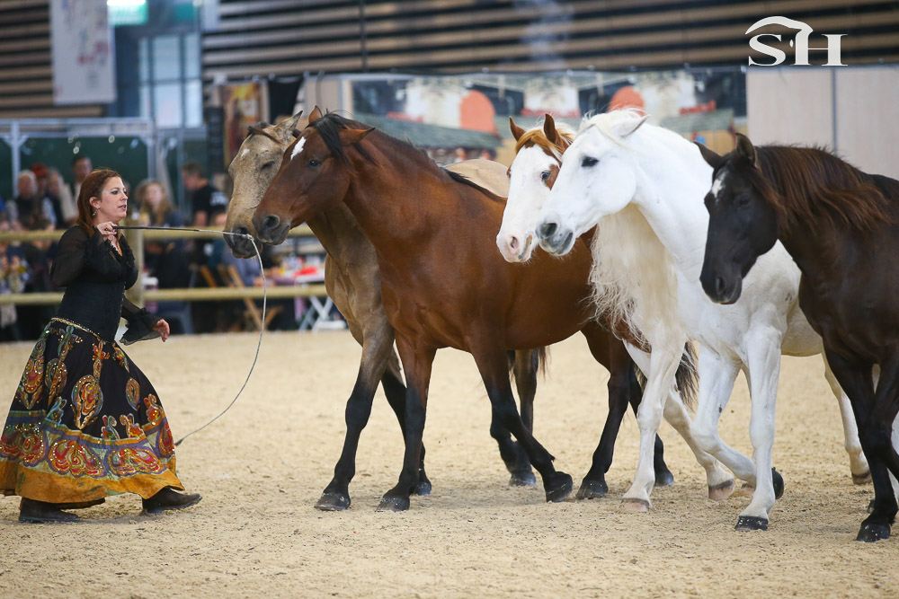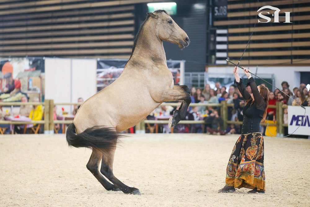 « En spectacle, j’évolue principalement avec des Ibériques. J’ai à la fois des chevaux espagnols et portugais puis j’ai un petit welsh qui est un peu le comique de l’équipe et un mustang qui est arrivé chez moi en 2021. Au départ, il m’a été confié par une société allemande pour que je le travaille avant son passage aux enchères. En principe, les personnes qui les travaillent ne peuvent pas participer aux enchères mais nous avons rassemblé une cagnotte et une de mes amis s’est portée acquéreuse. Contrairement aux chevaux sauvages en Europe, le mustang n’est absolument pas domestiqué, du coup, il y a un sacré travail à faire, c’est un véritable défi. Ces chevaux sont très appréciés en Allemagne et nous avons réussi à l’acquérir pour 19.000 euros! Malheureusement, il a eu quelques ennuis de santé par la suite et il commence seulement maintenant à nous accompagner en spectacle en apportant sa petite pierre à l’édifice. Pour moi, c’est très important que chaque cheval amène ce qu’il peut en fonction de ses qualités et ses capacités. »